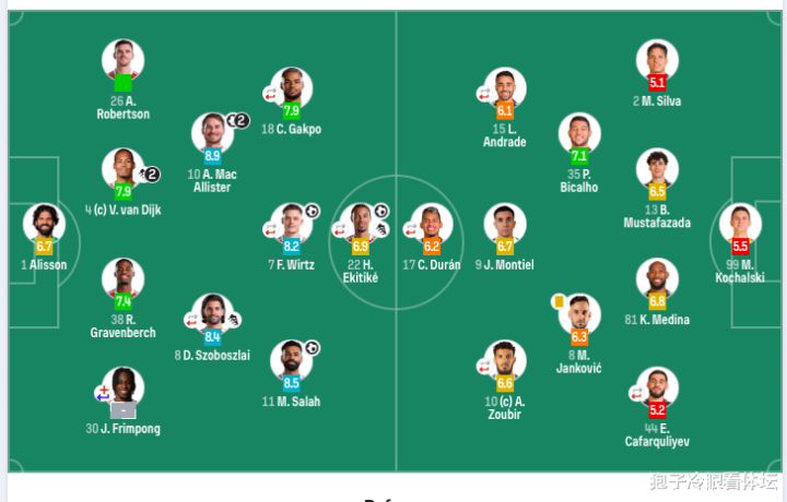 利物浦首发:1-阿利松、4-范戴克、26-罗伯逊、30-弗林蓬(4’3-远藤航)、8-索博斯洛伊(75‘65-纳洛)、10-麦卡利斯特、38-赫拉芬贝赫、7-维尔茨(67’42-尼奥尼)、11-萨拉赫、18-加克波(75’14-基耶萨)、22-埃基蒂克(67’73-恩古莫哈)。