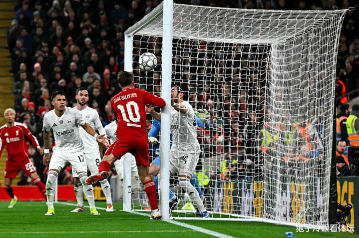 第14分钟,利物浦获得角球,埃基蒂克前点后蹭,范迪克的头球变成助攻,虽然门将做出神奇扑救,但麦卡利斯特的头球已经越过门线,进球有效。